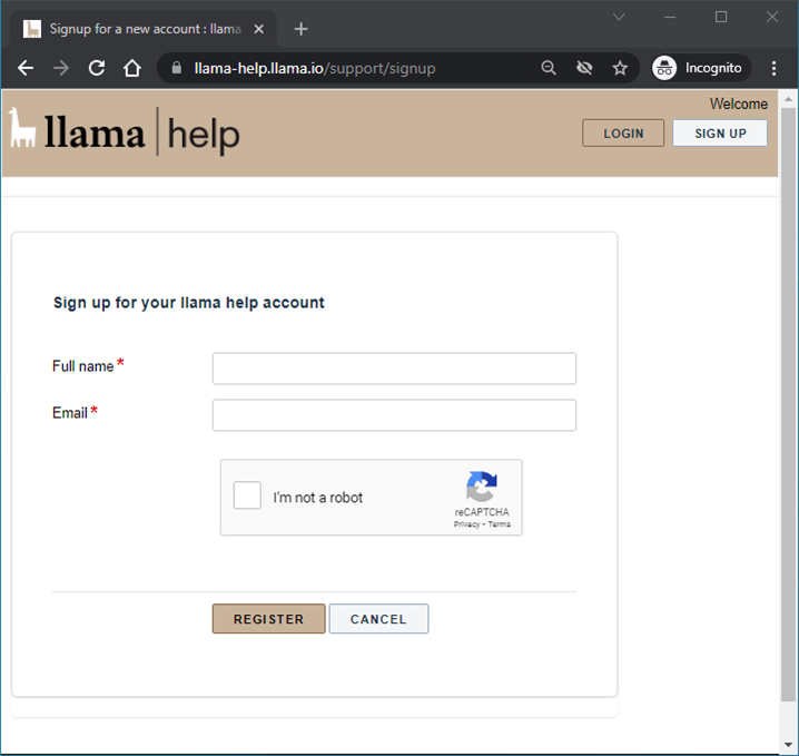 1. Navigate to the llama help support portal and click Sign up.